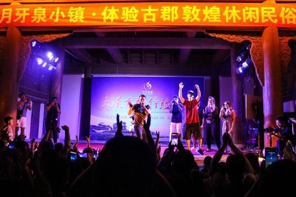 在篝火晚會(huì)現(xiàn)場(chǎng),西班牙明星團(tuán)表演了說(shuō)唱、口技BOX和歌曲《成都》等節(jié)目。他們的即興表演精彩絕倫,令觀眾大飽眼福,掌聲喝彩聲迭起,臺(tái)下上千名游客紛紛開啟閃光燈、揮動(dòng)著熒光棒助興。登臺(tái)的節(jié)目中還穿插了敦煌民俗非遺文化曲子戲《怕老婆點(diǎn)燈》等一系列精彩表演,讓中外游客們?cè)谇榫敖蝗谥惺艿搅酥袊?guó)非物質(zhì)文化遺產(chǎn)的魅力。精彩生動(dòng)的表演將歡樂(lè)氣氛推向高潮。西班牙明星團(tuán)成員贊不絕口。一位歌手激動(dòng)地說(shuō),第一次來(lái)到月牙泉小鎮(zhèn),這里古樸的建筑、獨(dú)特的民俗風(fēng)情給我們一行留下了深刻的印象。