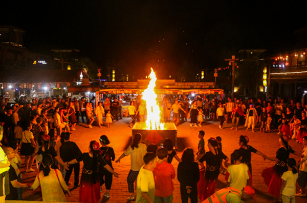 熊熊燃燒的篝火點(diǎn)燃了觀眾的激情。音樂(lè)起伏,燈火閃耀,游客們無(wú)所拘束縱情聯(lián)歡,一邊伴隨著音樂(lè)韻律盡情舞動(dòng),一邊拍手擊節(jié)低吟淺唱,沉浸在無(wú)比歡樂(lè)之中。